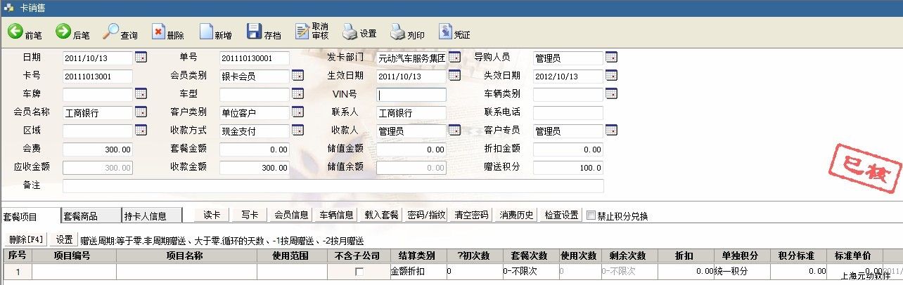 前言:有客户在使用会员管理功能时遇到一个实际情况就是指会员卡的预售,如送客户或者送员工消费卡然后自己到门店消费。那么汽修行业也存在这种预售会员卡方式。在软件中如何操作这种情况的呢?请看下面截图以及说明。