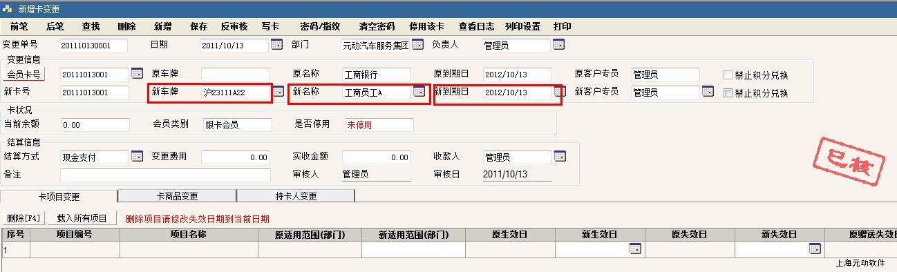 2、员工来店维修时,操作【卡变更】,记录员工车牌号、名称以及需要重新定义一个到期日。(以会员第一次来消费为开始日期,所以需要变更卡到期时间)。