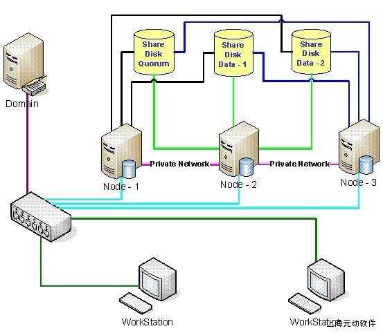 而N+1的SQL Server群集,是多个SQL Server共享一台备用服务器。这样,如果有两个SQL Server服务,则只需要2(提供服务的服务器)+1(备用服务器)=3台服务器。