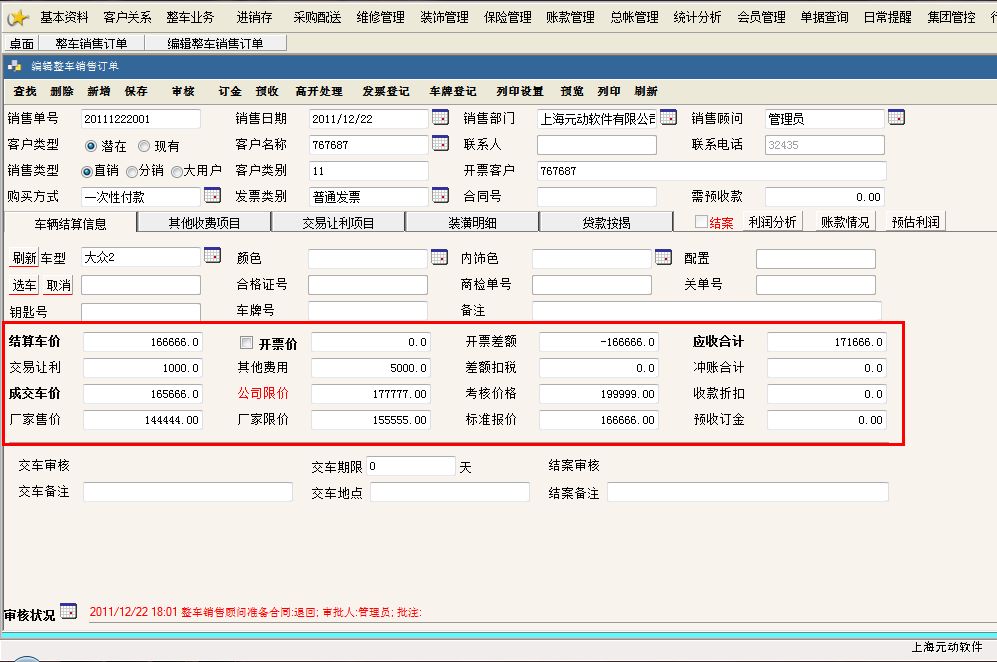 在整车销售单中,有很多价格,很多客户不能理解这些价格是如何计算出来,此贴为大家做一个公式的分析,软件界面如下图:
