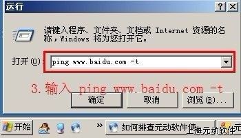 点击电脑左下角 1.开始--2.运行--3.输入:ping www.baidu.com -t (如不知操作,请参考图1、2)