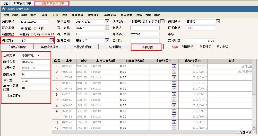 完成车辆结算信息、其他收费项目、交易让利项目、装潢明细的编辑后,开始操作“贷款按揭”,