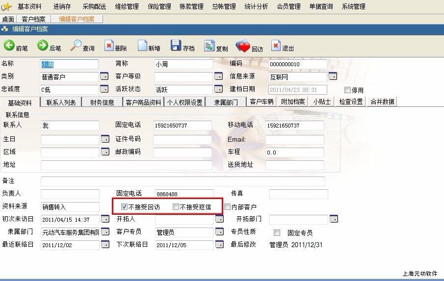 那么元动系统在这方面增加了一个不接受短信及不接受回访的功能。(此功能在20111214版中增加)
