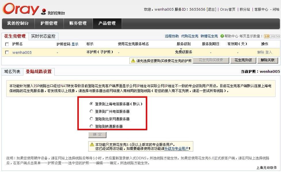 1、请登陆至Oray网站进入[我的控制台]—[产品管理]—[花生壳管理] —[登陆线路设置中自行选择登陆至与服务器当前接入的网络供应商相同登陆线路--[确定即可,如图: