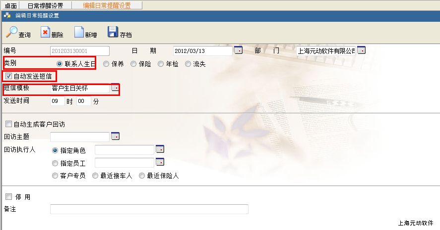 1)类别:联系人生日--------根据客户档案上的生日,短信会在客户生日当天发送;