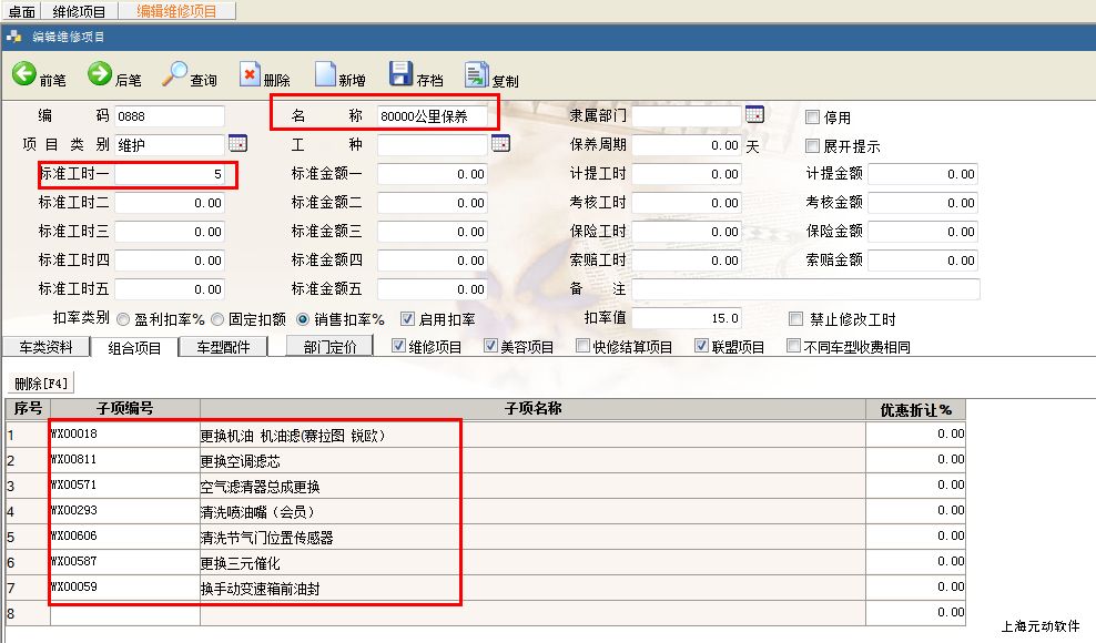一、组合项目的设置 从“基本资料--维修项目”中,点击【新增】按钮,增加一个维修项目,如下图: