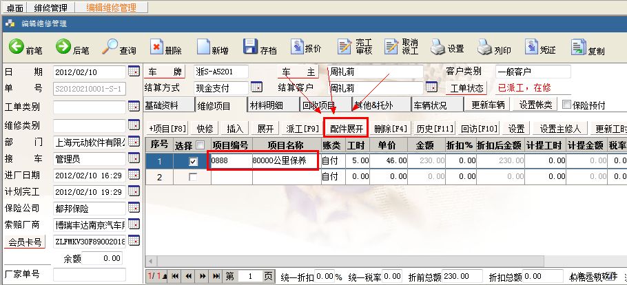 二、组合项目的应用 1)新增一张维修工单,添加“80000公里保养”组合项目,点击“配件展开”,如下图: