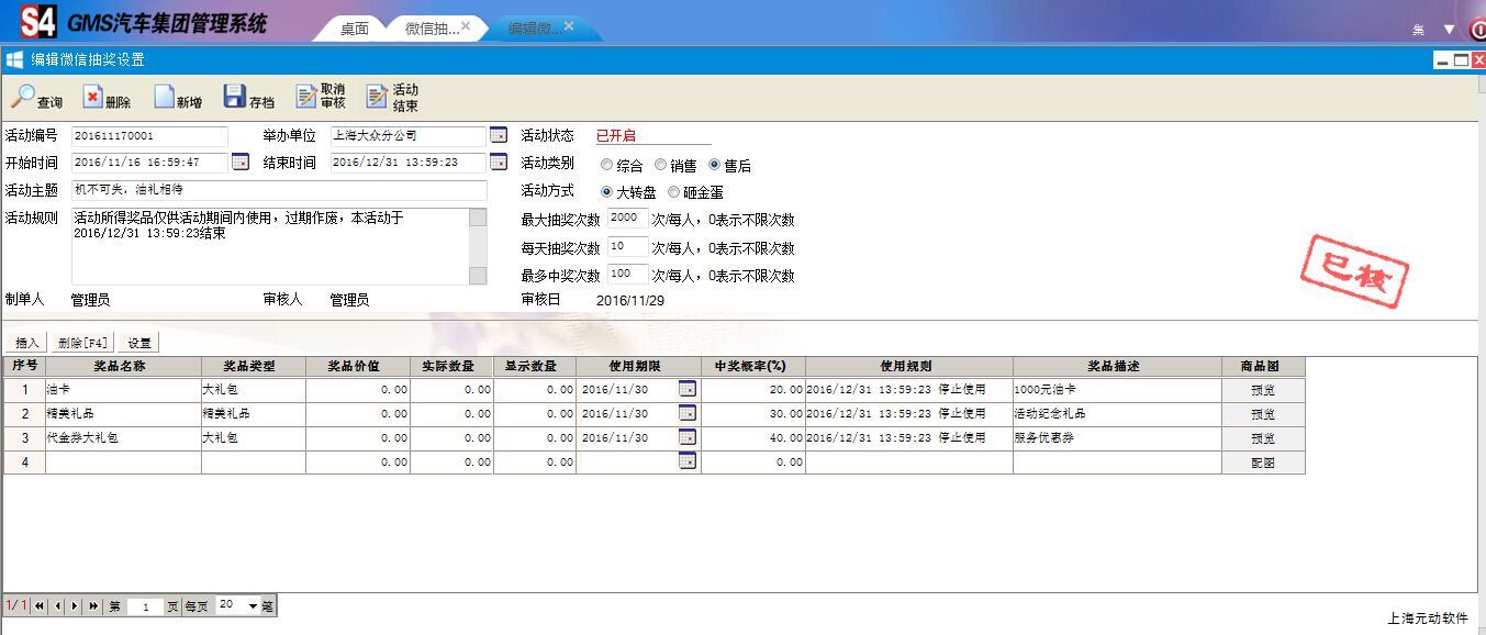 ③ 活动状态:活动开启状态,单据审核后出现开启(结束)活动按钮控制此属性