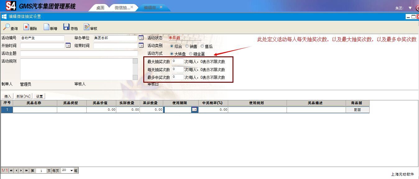 ⑩ 最大抽奖次数、每天抽奖次数、最多中奖次数:按需要设置,0代表不限次数