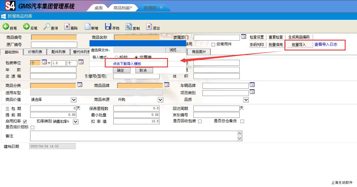 1、商品档案新增界面点击【批量导入】按钮可打开导入窗口,如下图所示,点击下载导入模板填充数据。