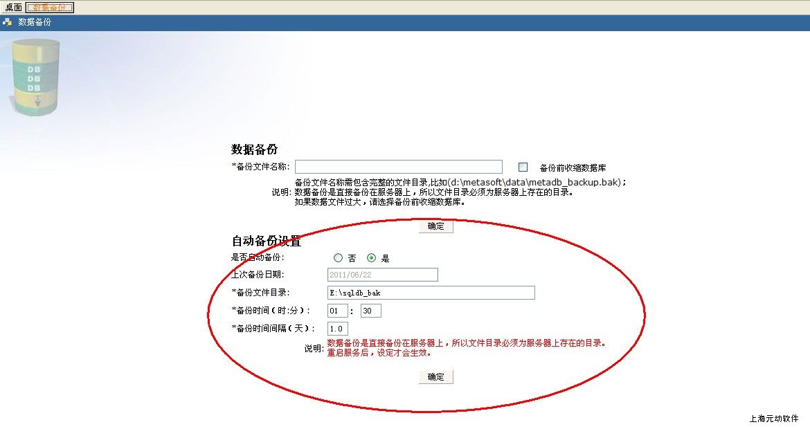 自动备份选择“是”,备份文件目录选择数据库所在服务器目录,备份时间填写每天什么时候备份,间隔天数填写间隔多久备份,填写完毕,点击确定,重启服务器!