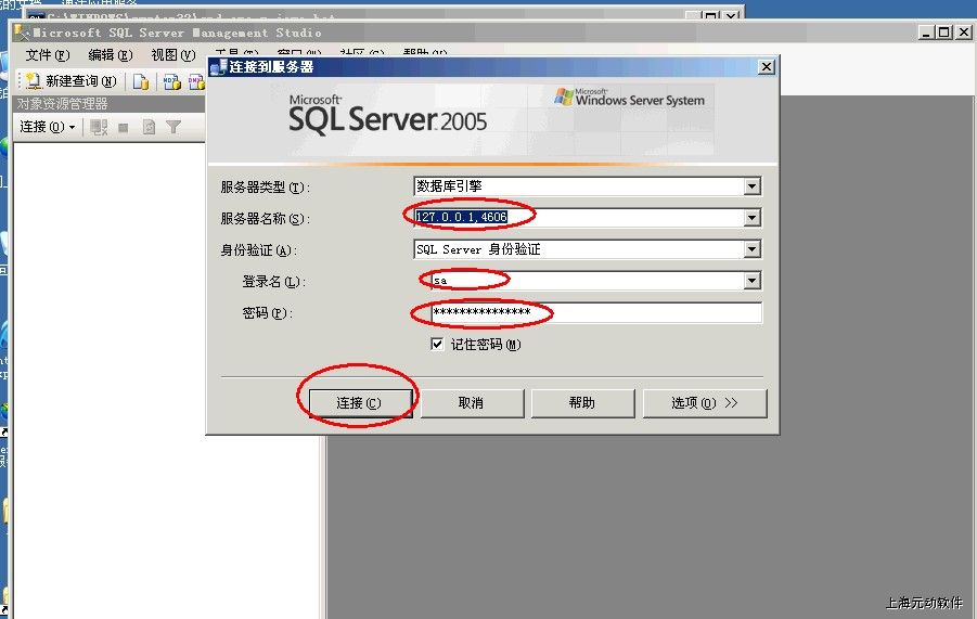 第一步:打开SQL2005企业管理器,名称为Microsoft SQL Server Management Studio(SQL2000参考);填写服务器名称,登录名,密码等,点击连接,如图所示: