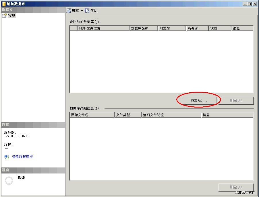 第三步:在附加界面,点击添加按钮,添加老的数据库MDF文件,如图所示:
