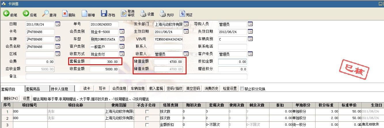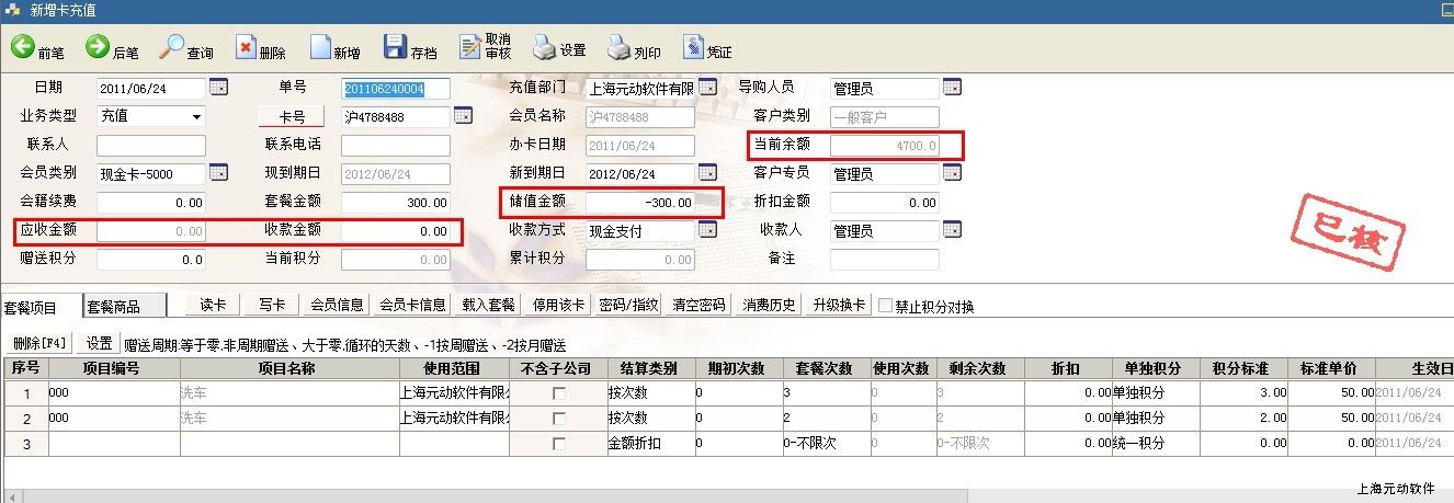 在【卡充值】界面,先载入客户需要购买的套餐,在储值金额栏位输入负的套餐金额,这样应收金额就显示为0,直接消减会员卡储值金额。