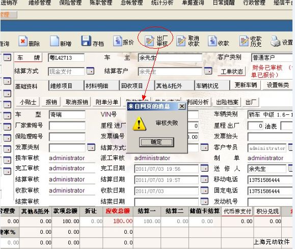 有客户反映,在维修管理中,操作结算,收款后,点击‘出厂审核’,系统提示“审核失败”!
