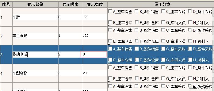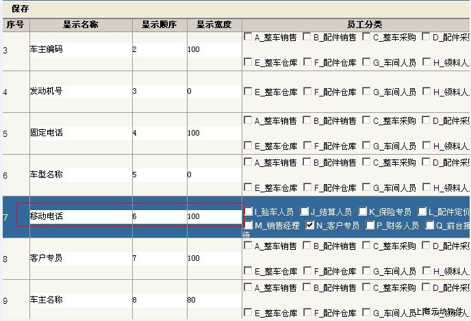 解决方案:移动电话栏位需显示时,请确认1,栏位设置的显示宽度不为0,2,权限设定,需勾选客户专员;