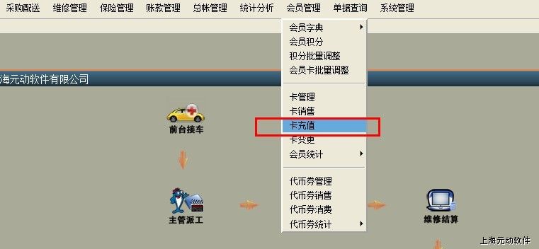 1、在主菜单会员管理下找到【卡充值】,会员卡升级在【卡充值】里操作。