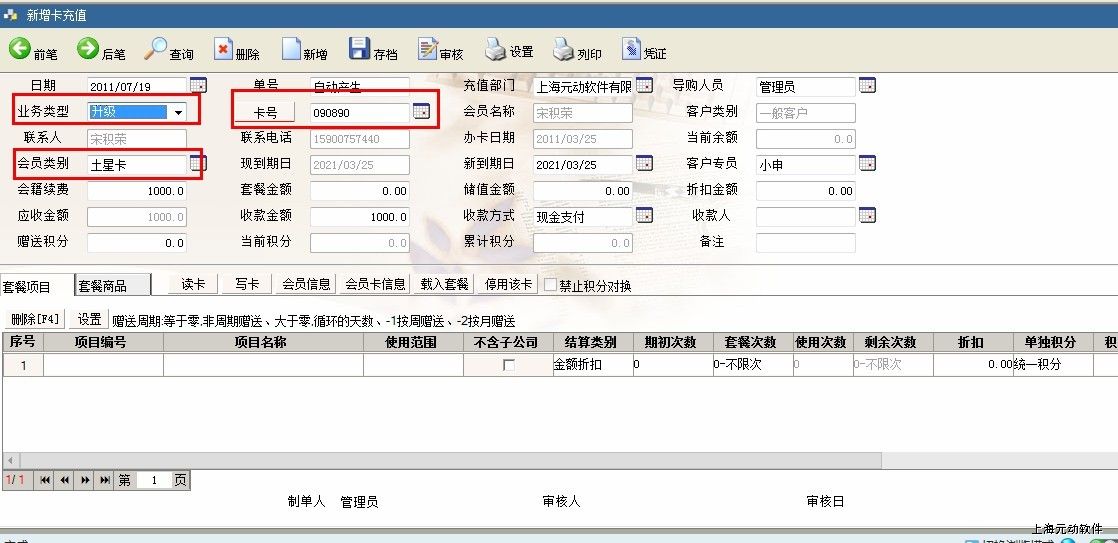 升级卡需要的费用可在【会籍续费】栏位里输入费用金额。可载入升级会员的卡套餐。