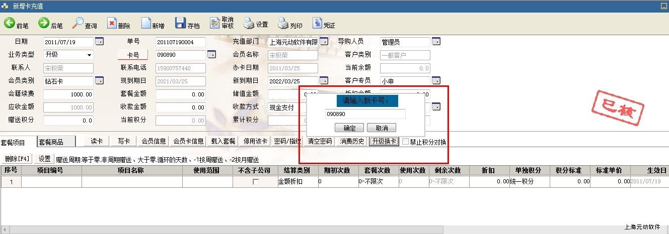 3、第五步、会员需要更换卡号情况时,在【卡充值】单据审核后右下角会出现【升级换卡】按钮,点击出现输入新卡号的输入框,