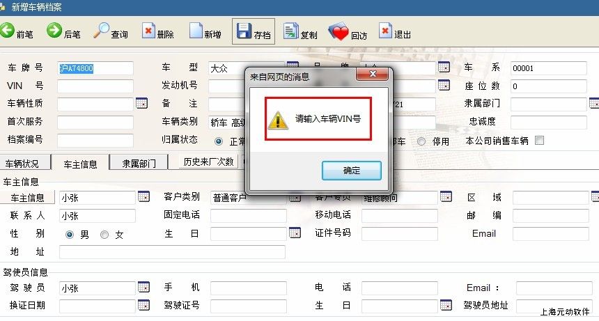 在录入车辆档案时经常会碰到VIN号的输入问题,如下图显示,有些客户要求必须输入有些客户则可输入也可不输入。