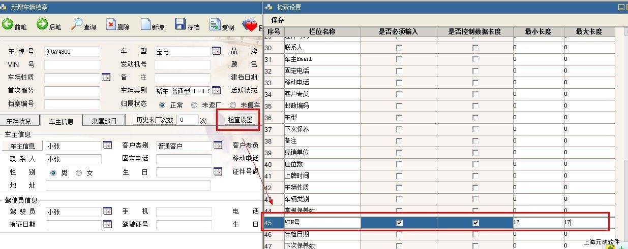 第二个地方VIN号的控制是指车辆档案中【检查设置】中的控制,如图指示: