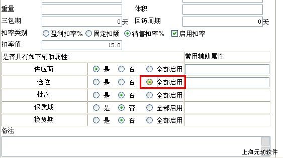 2.打开基本资料-商品档案,选择一个商品资料,双击打开,在辅助属性中选择仓位,全部启用,存档后关闭,如图所示: