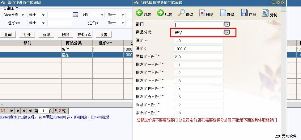 2、设置各种售价根据进价的比例,需要注意这个进价区间栏位,这个是指单个商品的进价,只有在这个进价区间及这个商品分类的商品才会自动产生售价。