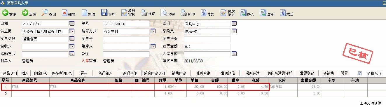 3、做一张采购入库单试试这个功能。