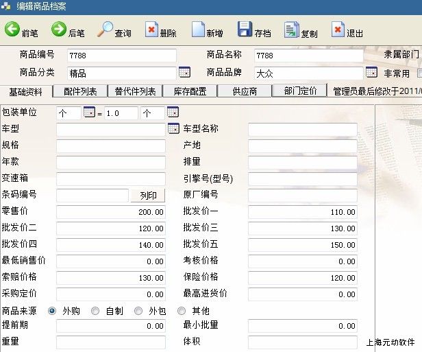 商品档案中有多种售价,维修领料出库、销货出库单价取的是商品档案中的售价。这些售价可以通过采购入库时按照设置的比例自动产生,需要注意的是如果商品有多次进货入库,且入库单价不同那么每次入库都会根据设置的比例更新这些售价。