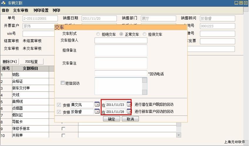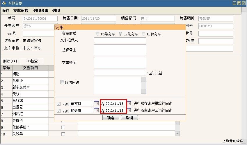 当前实际时间是:2011-11-21。那么在车辆交割审核的时候安排回访的日期就发现不对了。看图红色标记