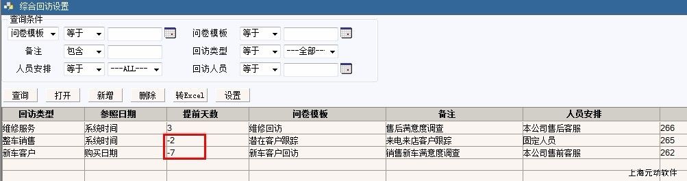 如下图所示:在【综合回访设置】中设置整车销售需要进行潜在客户跟踪、新车客户回访时,分别设置2、7天。