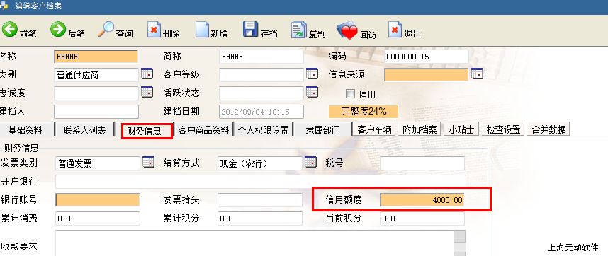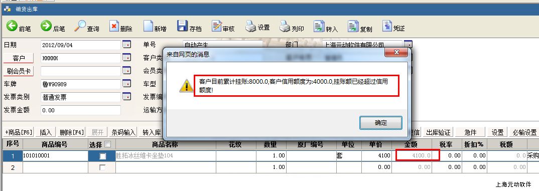 3,当客户消费挂账时,系统会根据信用额度进行分析,超过额度,系统会给予提示,且不让此业务单据审核生效;