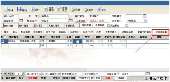 2.维修过程中需要洗车的车辆,如钣喷事故车辆,维修过程中可能需要洗车多次。可以由服务顾问进入单据,点击【生成洗车单】按钮,如图,