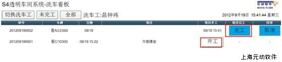 4.洗车单生成后,可由洗车工进入洗车工看板(.../tpws/xc),对洗车任务进行开工/完工,如图: