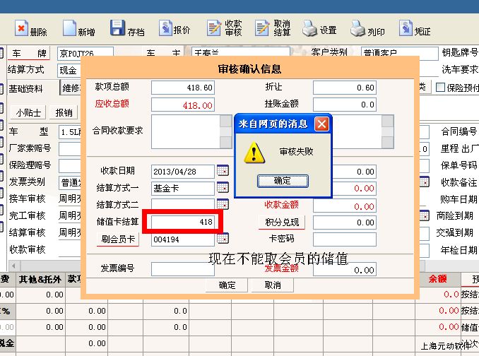 案例:客户充值会员卡(如:1000元),维修消费400元,用会员卡进行结算;点击“收款审核确认时,系统提示“审核失败”;(如下图)