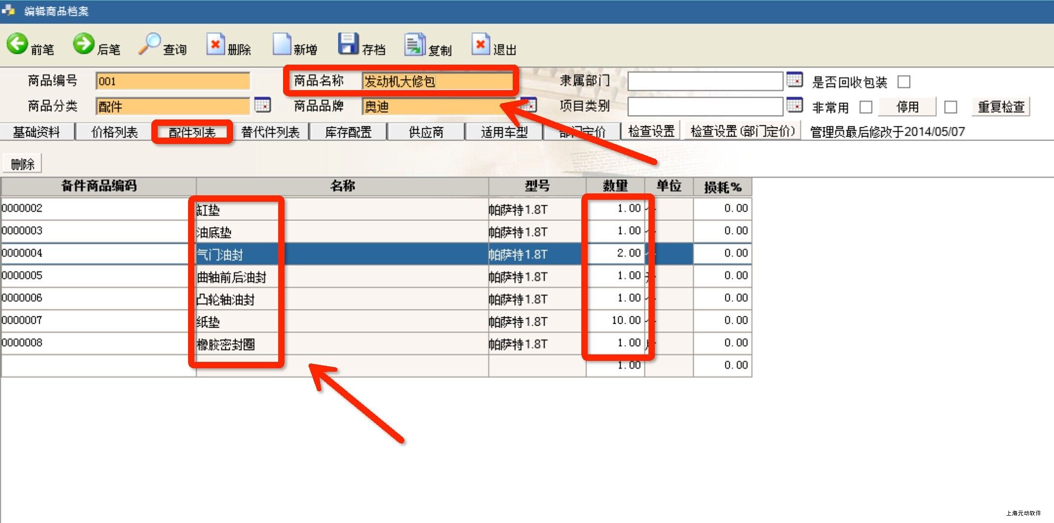 例如:将缸垫、油底垫、气门油封(2个)、曲轴前后油封、凸轮轴油封、纸垫(10个)、橡胶密封圈