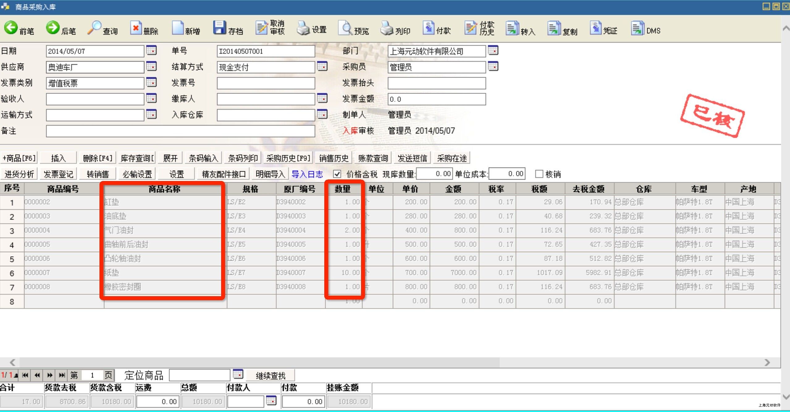 系统会在“入库商品”中产生对于的明细,审核完成拆分入库。