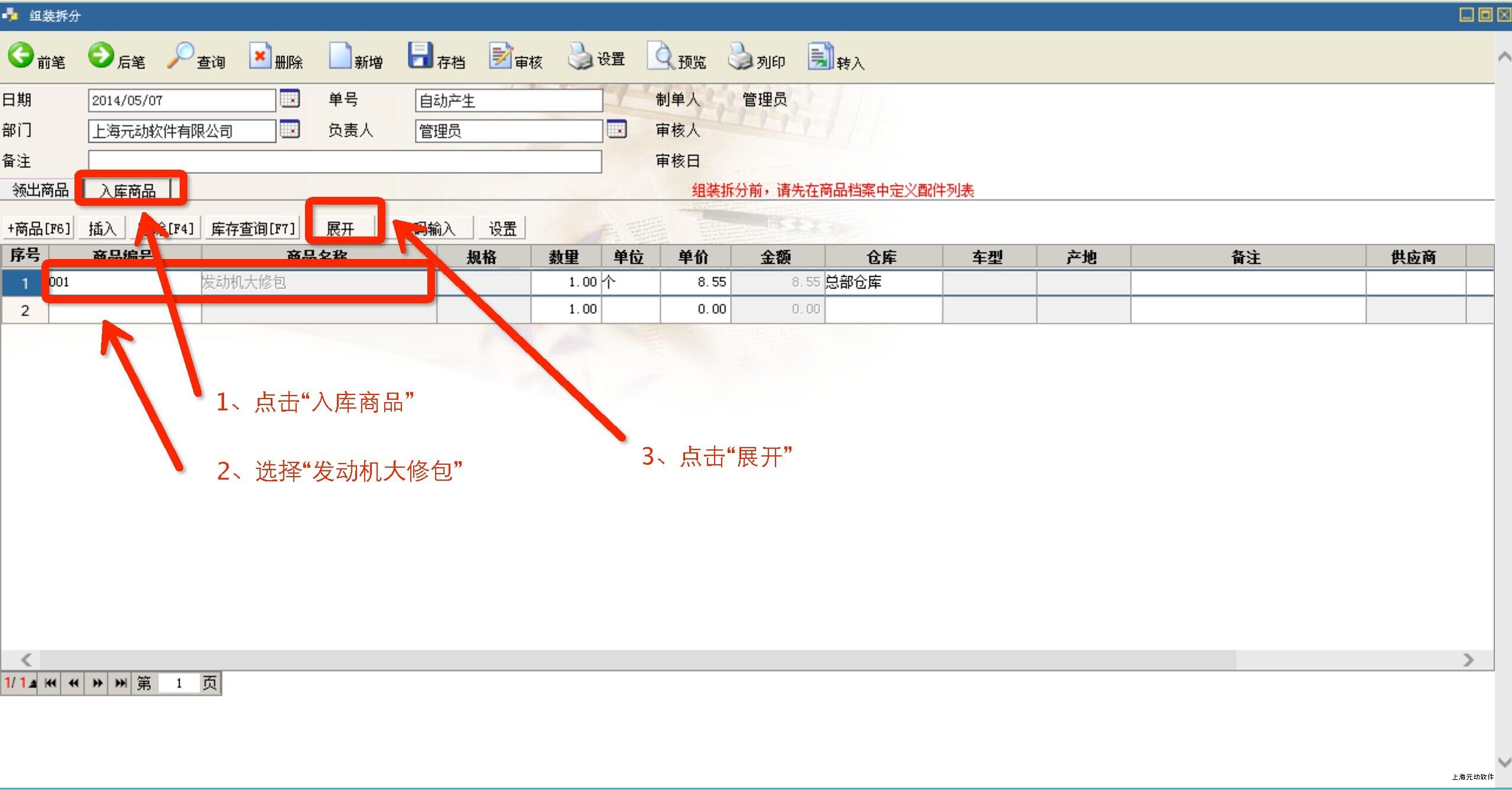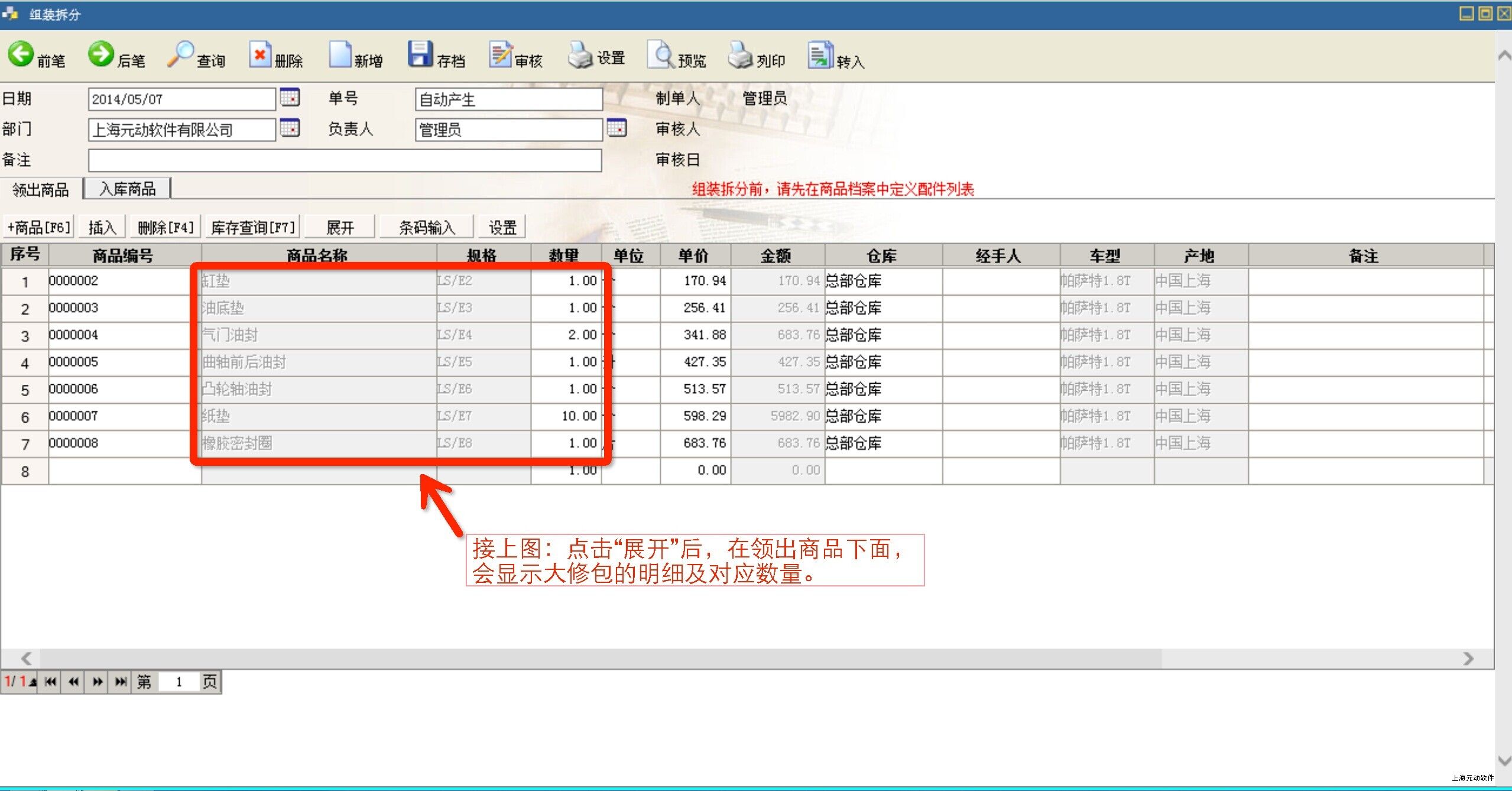 拆分入库时,在步骤②时,在“领出商品”中选择大修包,并点击“展开”