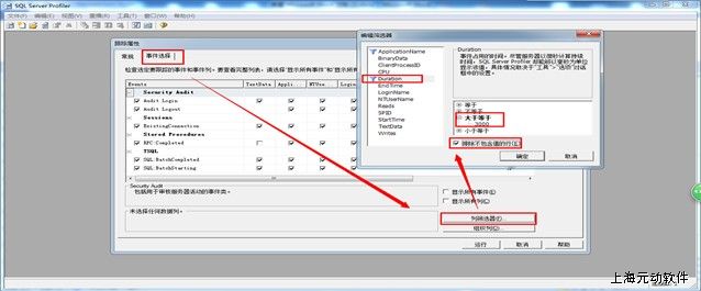 打开事件选择页面—》点击列筛选器—》选择Duration—》大于等于中输入3000(代表运行超过3秒的SQL)—》勾上排除不包含值的行—》点确定—》点运行