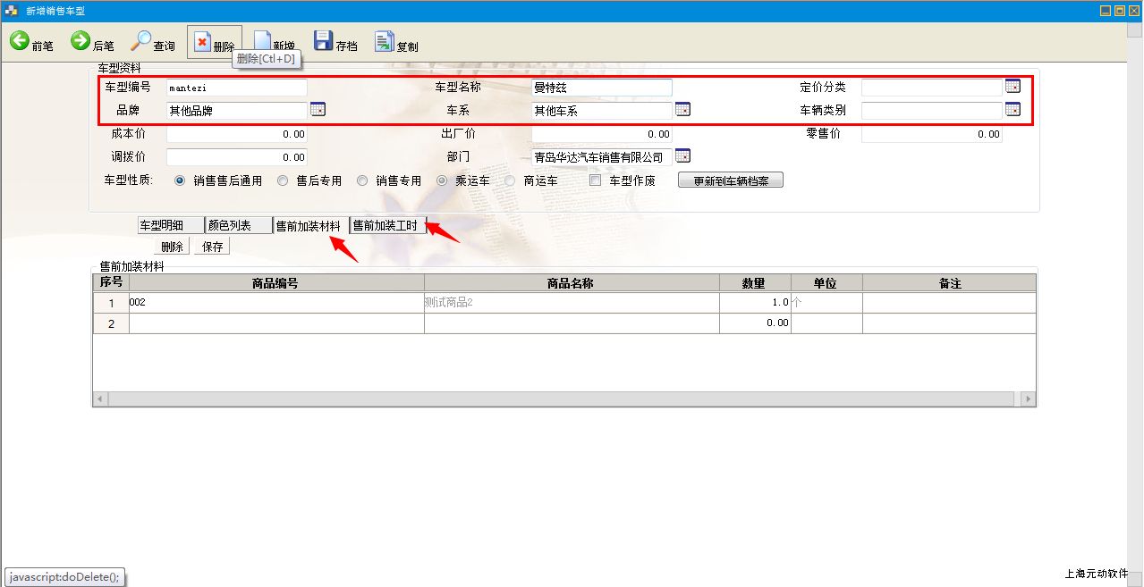在销售车型中定义变更以后的新车型,可定义变更为新车型所需的项目和材料信息,选择以后项目和材料信息会自动载入。