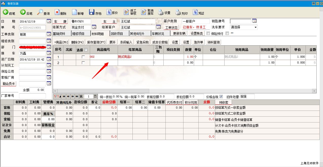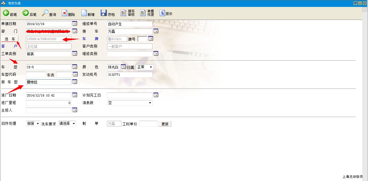 在售前加装页面(维修业务 - 美容装饰 - 售前加装)选择库存车,再去选择将要变更的车型,材料与项目根据之前定义带出,默认账类为免费,工单类别默认为前装。