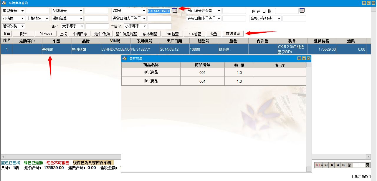 在该售前加装单结算以后,该库存车的车型发改变,变更为新车型。车辆库存查询中 前装查询 按钮点开可显示该车辆已经结算的前装材料信息。
