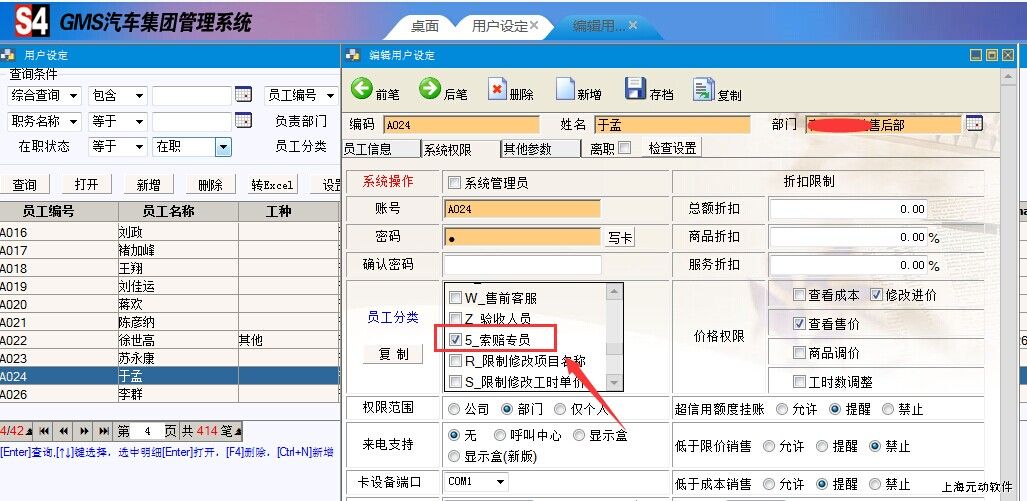 2、在用户设定中给索赔员用户设定好索赔专员的分类。