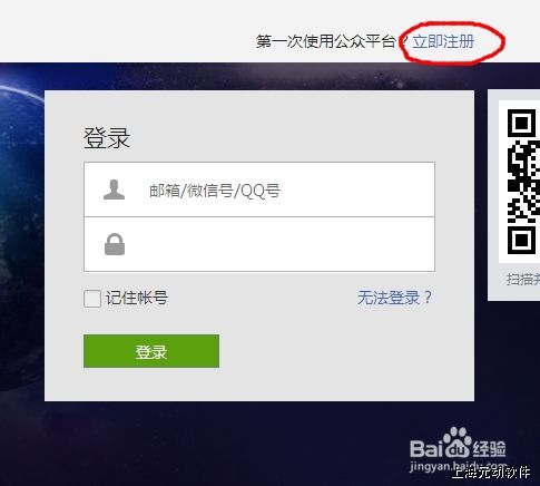 这个可以在百度输入“微信公众平台”就能找到官方网站。然后在进入官方网站后,找到“立即注册”并直接点击进入。如下图所示: