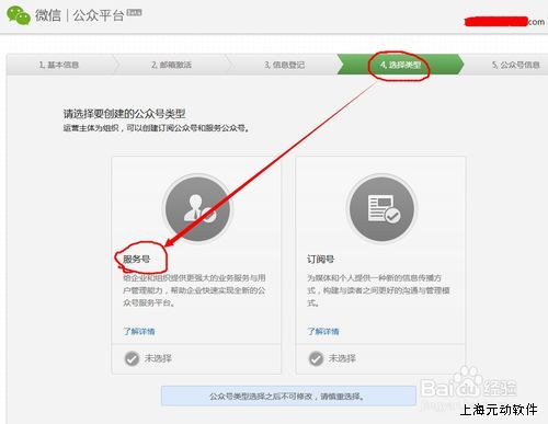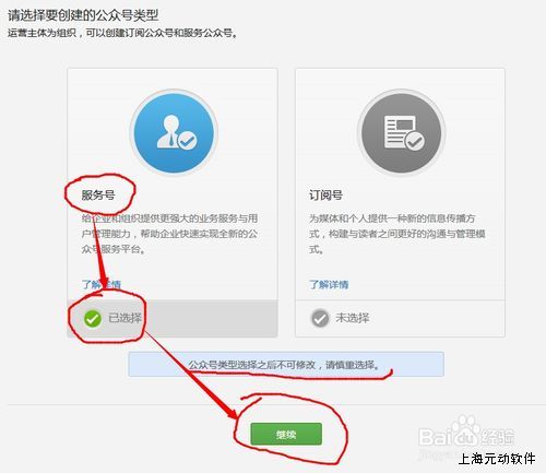 第五、按照步骤填完所有资料后,我们点击“继续”,进入到下一步,选择帐号的类型图。在帐号类型里面有两项,服务号、订阅号。我们这里选择服务号。选择完成后直接点击“继续”,如下图所示: