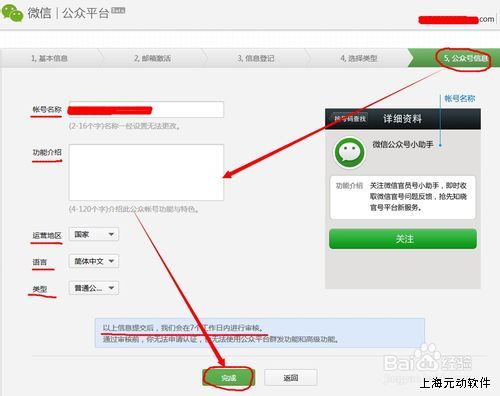 第七、我们点击“确定”后,就直接到了“公众号信息”选项卡里面,在这里我们要输入帐号名称、功能介绍、地区等信息认真填写。帐号名称也只有一次机会,确定后是不能更改的。所有填写完成后,我们直接点击“完成”。如下图所示: