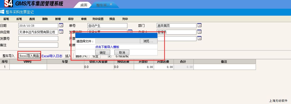 整车采购发票登记时,针对大批量的采购,单个点击添加显得繁琐低效,为提高系统操作人员的工作效率,S4增加了Excel导入功能,同时对这个页面进行了一下调整,具体功能及操作如下: