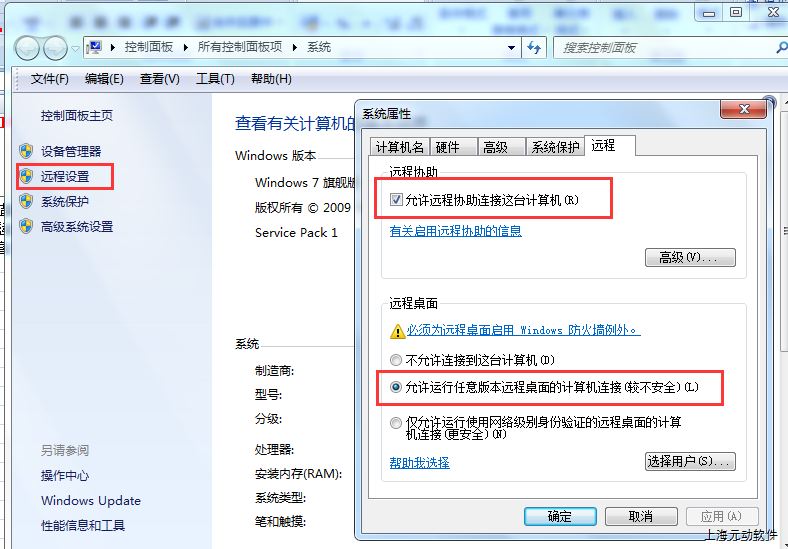 一、在服务器端上右击我的电脑——属性——远程,勾选允许远程协助连接这台计算机。