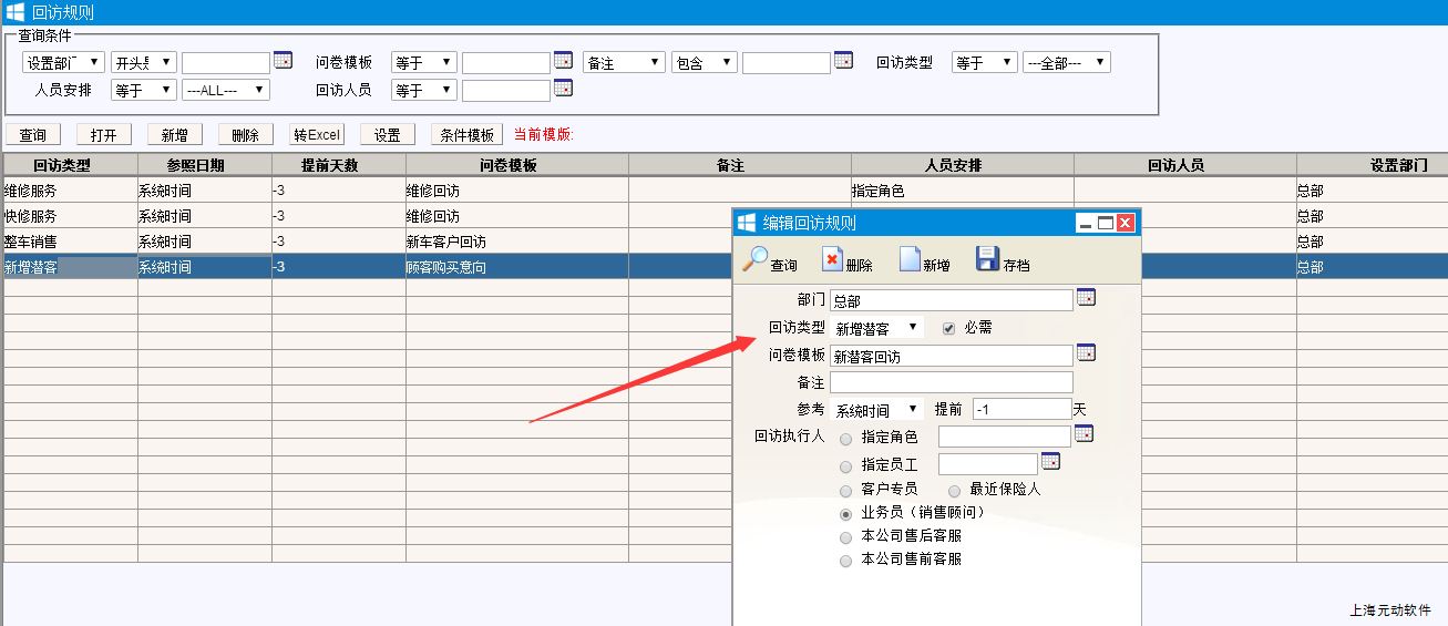 在回访规则中设定好新客户回访规则。