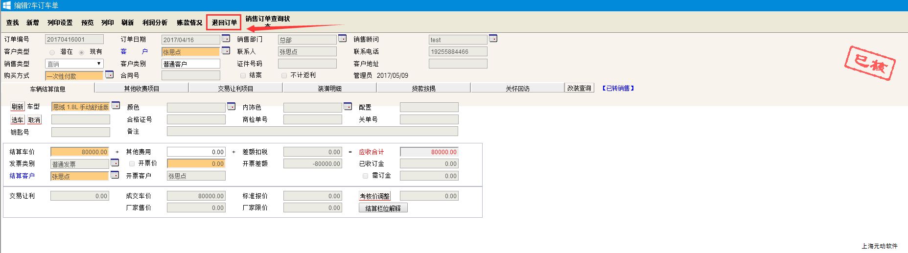 整车订车单转入整车销售单后增加了退回订单的功能,前提是整车销售单是在【未审批】状态下方可正常退回至订车单。S4版本:20170407